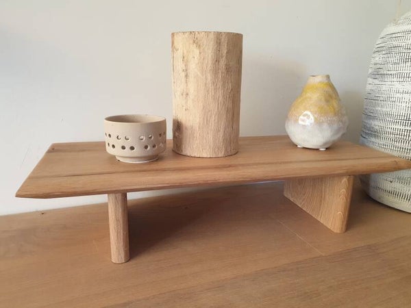 De verhoger is aan de bovenkant afgerond voor een zachte uitsraling. de onderkant is afgeschuind om het geheel een chique uitstraling te geven. De pootjes zijn aan de voor en achterzijde dubbel afgerond. Het geheel is afgwerkt met speciale eiken-olie.